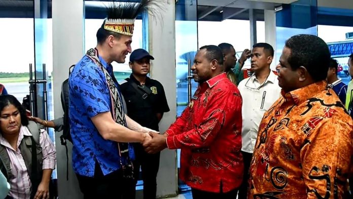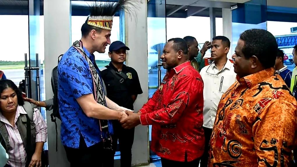 Rombongan Duta Besar tiba di Bandar Udara DEO Sorong, pada Minggu (15/6/2025), disambut hangat dengan prosesi adat berupa pemakaian Mahkota Kasuari dan syal tenun khas suku Malamoi, serta tarian tradisional Papua Barat Daya.