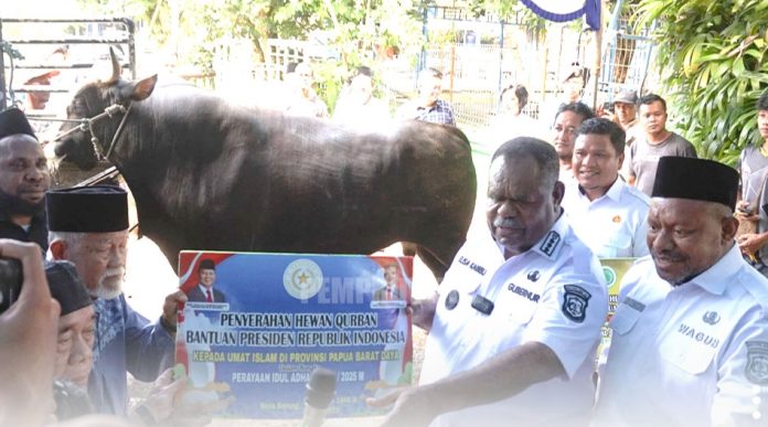 Bersamaan dengan hal itu, Gubernur PBD juga menyerahkan bantuan sapi kurban kepada masyarakat yang ada di satu kota dan lima kabupaten yang ada di Papua Barat Daya.