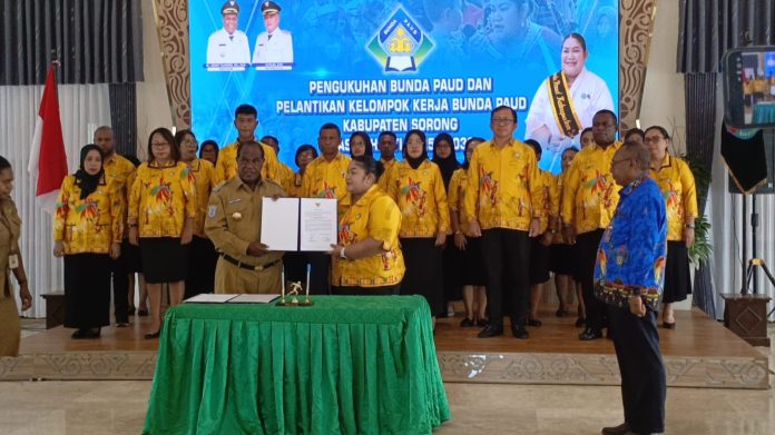 SORONG – Ny. Junita Linda Kamuru resmi dilantik sebagai Bunda Pendidikan Anak Usia Dini (PAUD) Kabupaten Sorong sekaligus mengukuhkan Kelompok Kerja (Pokja) Bunda PAUD masa bakti 2025–2030. Acara berlangsung di pendopo kediaman Bupati Sorong, Selasa (16/09/25), dihadiri pejabat daerah, tenaga pendidik, hingga kader posyandu.