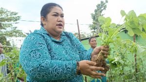 SORONG – Ketua TP-PKK Kabupaten Sorong, Junita Linda Kamuru, memimpin panen sayuran hasil pemanfaatan lahan pekarangan rumah, Selasa (12/08/25). Kegiatan ini menjadi bagian dari Program 6 Standar Pelayanan Minimal (SPM), yang salah satunya menitikberatkan pada peningkatan gizi masyarakat melalui ketahanan pangan keluarga.