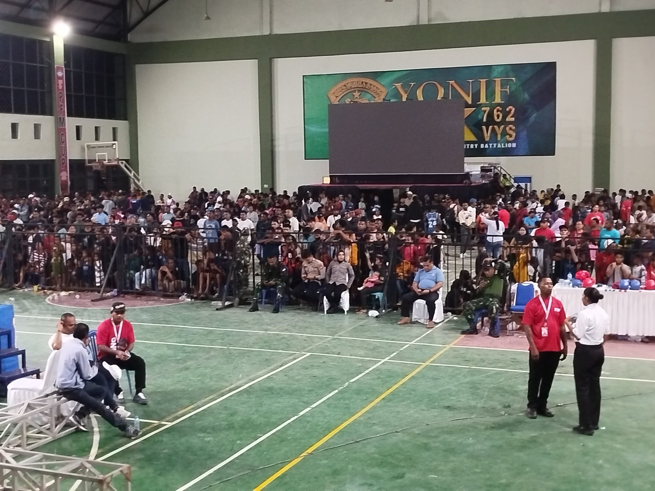 KOTA SORONG – Ribuan penonton memadati arena Kejuaraan Tinju Amatir PFM Cup I di GOR Serbaguna Yonif 762/VYS, Kota Sorong. Memasuki hari kedua pertandingan, Rabu (25/06/2025) antusiasme penonton sangat tinggi.