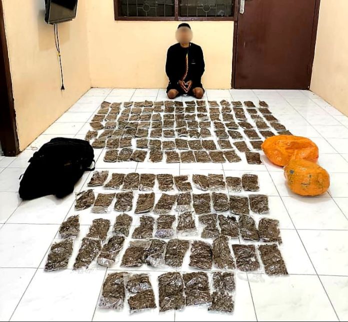 Tersangka diamankan di depan pelabuhan saat hendak meninggalkan lokasi menggunakan angkutan umum. Setelah dilakukan penggeledahan, Polisi menemukan sebuah tas hitam berisi paket ganja siap edar.