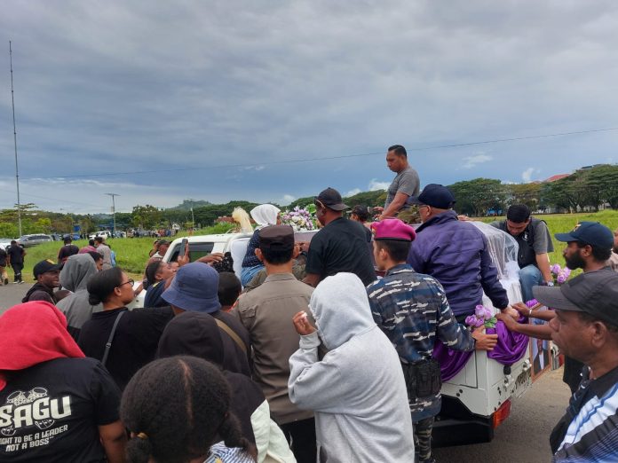 Jenazah diterbangkan dari Bandara Soekarno Hatta Jakarta dan mendarat di Sorong sekitar pukul 06.40 WIT. Tangis keluarga, kerabat, dan masyarakat pecah saat peti jenazah diturunkan dari kargo bandara sekitar pukul 07.00 WIT. Isak tangis terdengar di sepanjang jalur kedatangan hingga peti jenazah dimasukkan ke dalam mobil jenazah.